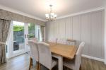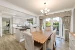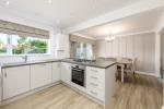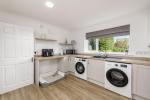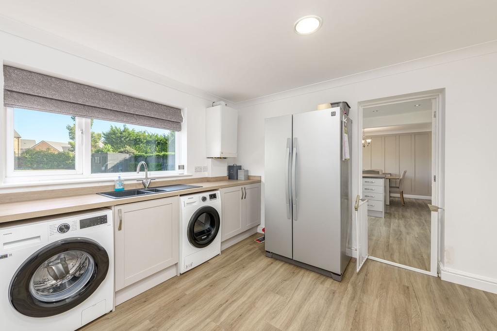The heart of the home is a modern kitchen/diner situated at the rear of the property. This kitchen is well-appointed, complete with a built-in Bosch oven, gas hob, and integrated dishwasher. There is ample room for a dining table, and the dining area enjoys views over the large garden, making it an inviting space for both everyday meals and gatherings. A separate utility room adds further practicality by keeping laundry and household tasks out of sight.