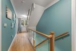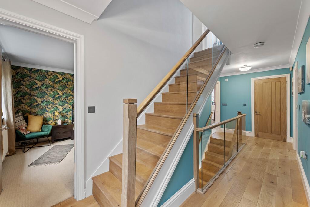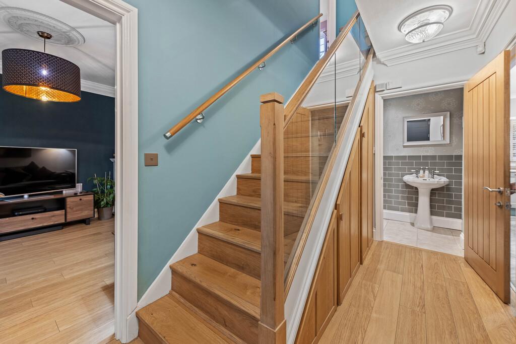 "Kloeber", timber "Funky" front entrance door to entrance hall with timber flooring, bespoke stairs in American light oak with glass balustrades, leads to first door accommodation. Understairs cupboards with American oak doors. Downstairs are radiators, alarm controls, ornate plaster coving and cieling roses. Doors leading to lounge, dining room, kitchen and wc.