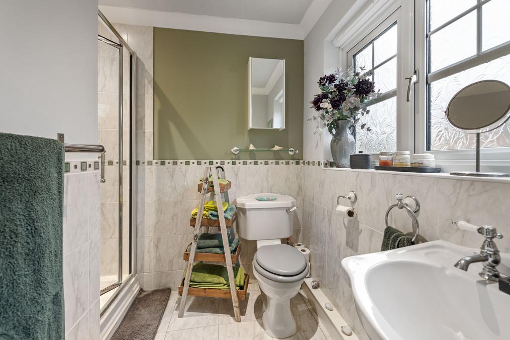 7' 4'' x 6' 5'' (2.26m x 1.98m) With white "Heritage" three piece suite comprising single shower cubicle, low level WC, pedestal wash basin, half tiling to walls, tiled floor, radiator, shaver point & extractor fan.