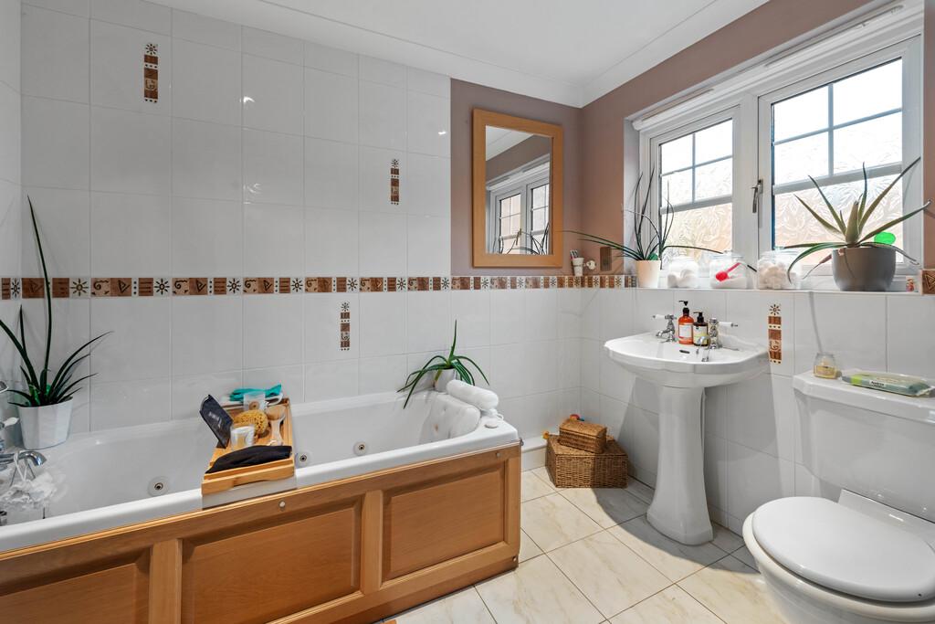 8' 7'' x 6' 7'' (2.64m x 2.03m) with white "Heritage" three piece suite comprising Jacuzzi bath, low level WC, pedestal wash basin, half tiling to walls, tiled floor, and designer mirrored cabinet, radiator, shaver point & extractor fan.