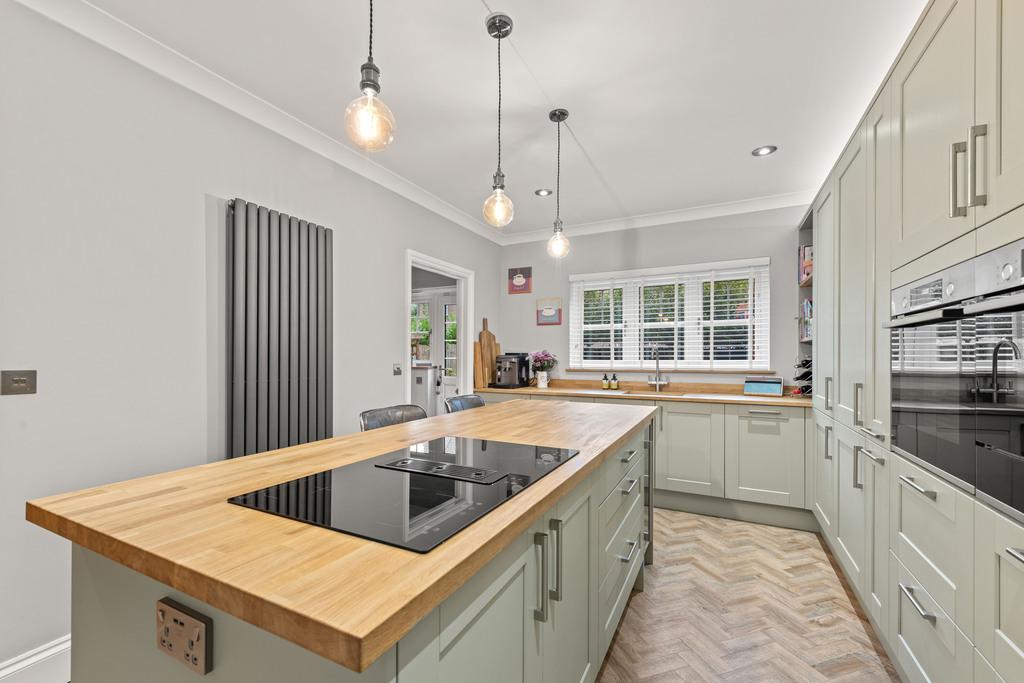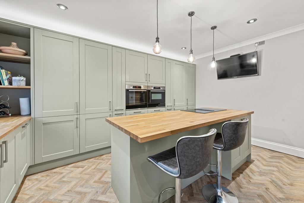 15' 8'' x 10' 11'' (4.78m x 3.35m) Newly installed Howdens kitchen (2024) Includes some Bosch appliances. There is a full height fridge, built in freezer, a Howdens integrated dishwasher, Double oven (1 combi), wine cooler & a 4 point hob with push up extractor. There are solid oak worktops & parquet flooring.