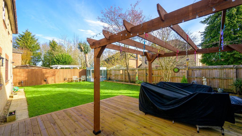 Outside provides off road parking for multiple vehicles + a detached double garage to the front of the property. Gated side access leads to the rear enclosed garden, which has recently been landscaped with a new decked seating area and pergola.