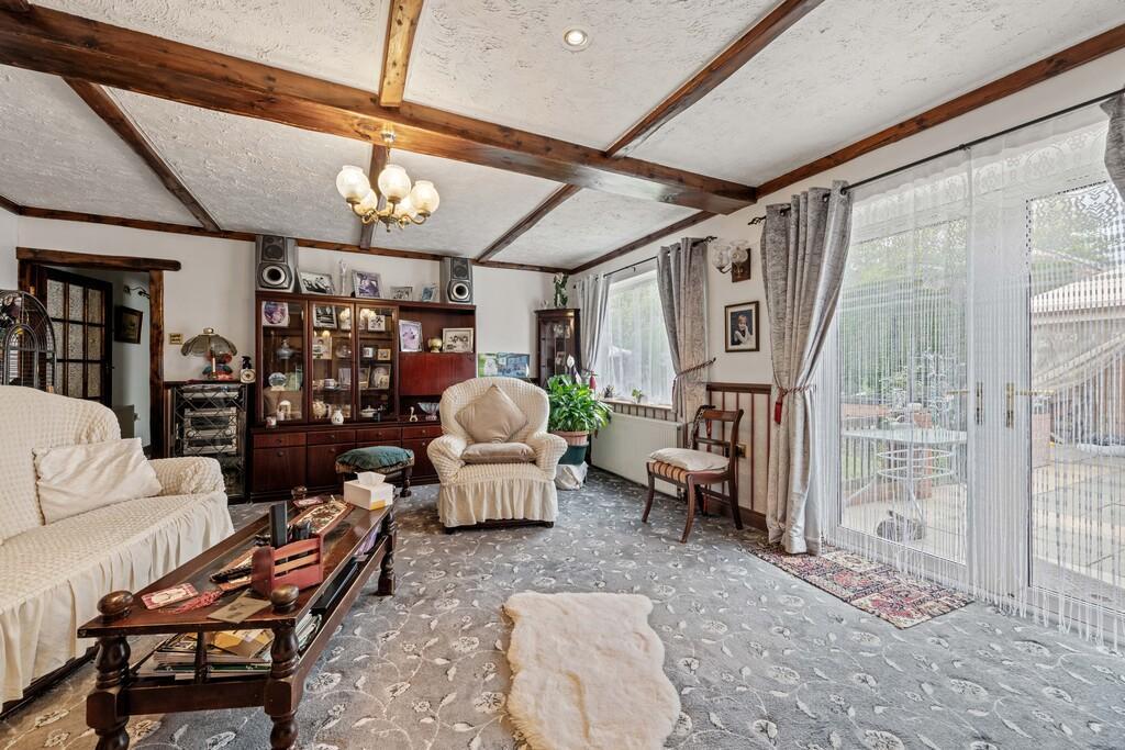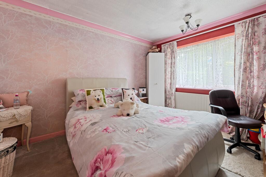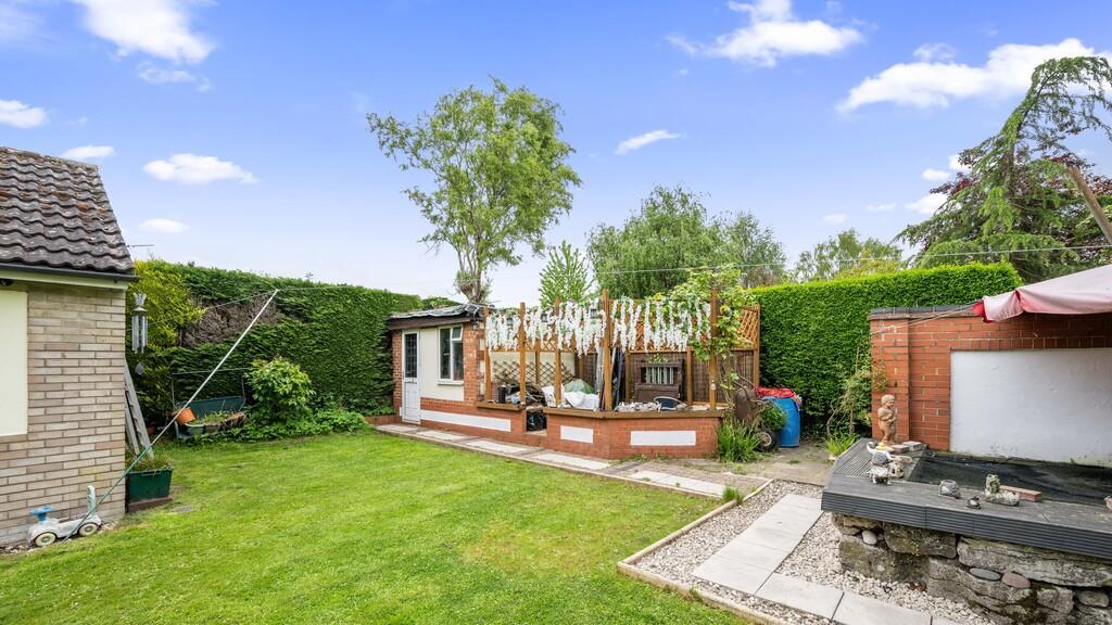 Outside the rear garden features a patio overlooking an enclosed L-shaped lawn bordered by mature shrubs and plants along with a detached workshop. At the front, a private driveway offers off-road parking and leads to the adjoining garage, while the front garden, primarily laid to lawn, is enclosed by a mature hedge.