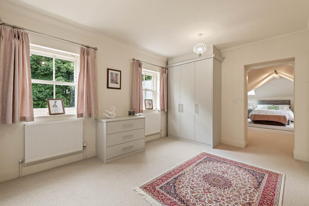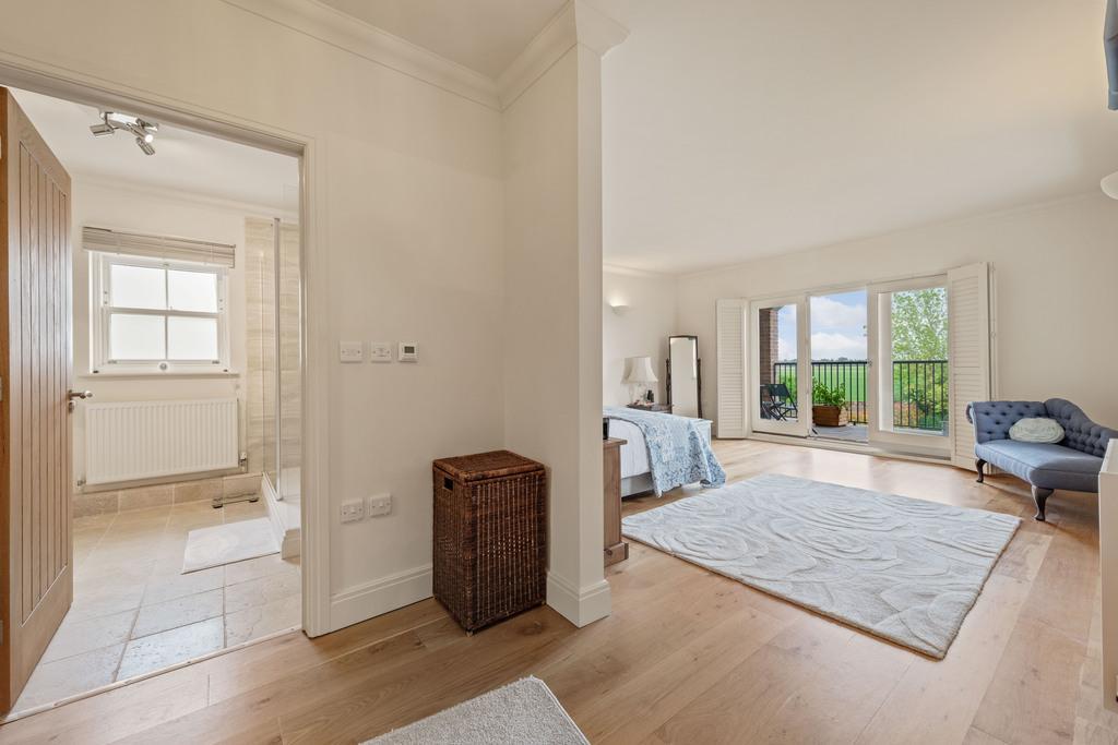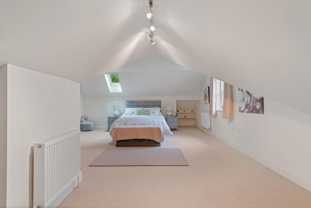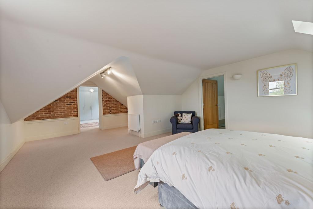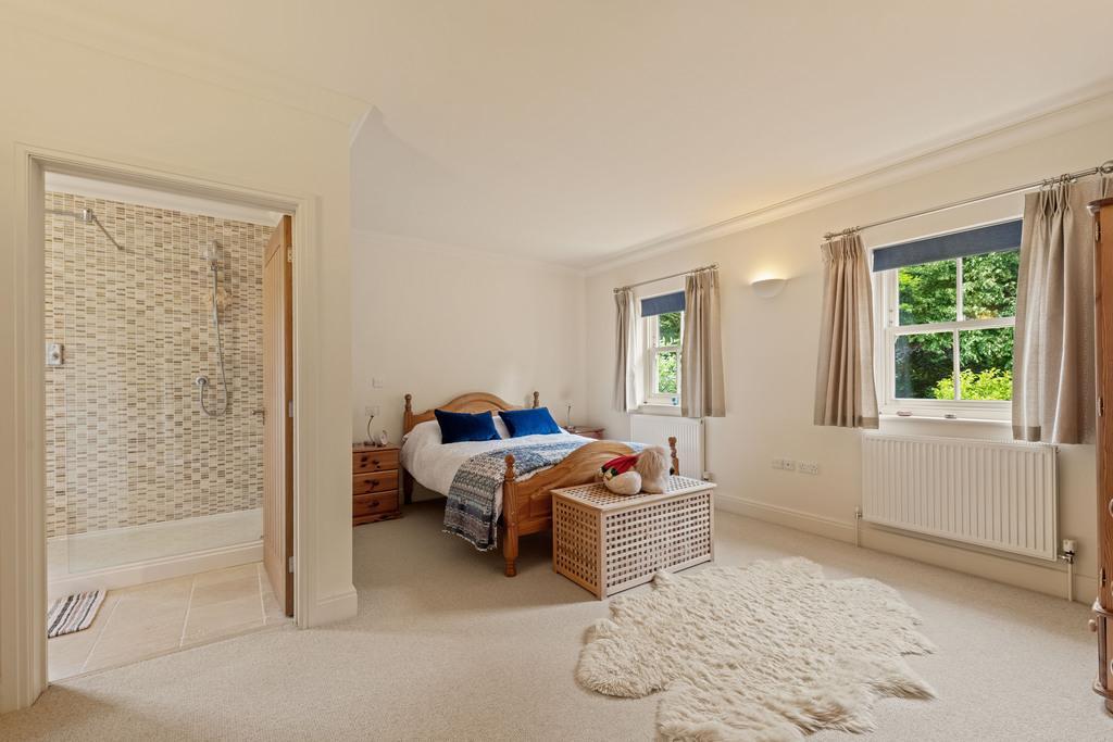 The first floor continues the sense of space and comfort, with an open landing doubling as a relaxed sitting area. The principal bedroom enjoys its own south facing private balcony, enjoying views over the fields behind, along with a walk-in wardrobe and a sleek en-suite bathroom. Two further bedrooms share a well-appointed Jack & Jill bathroom, while the second bedroom suite benefits from a large dressing room and its own en-suite shower room. A large room above the garage provides extensive accessible storage via the 2nd bedroom but also offers fantastic potential to be used as a playroom or sitting room.