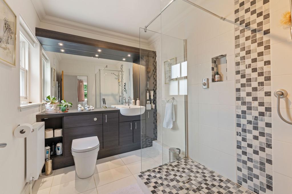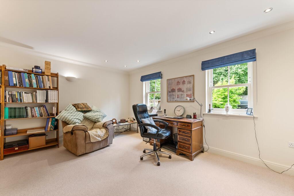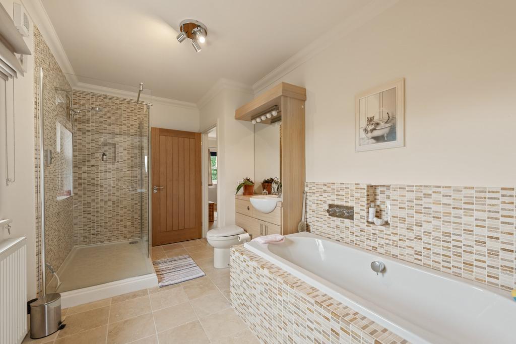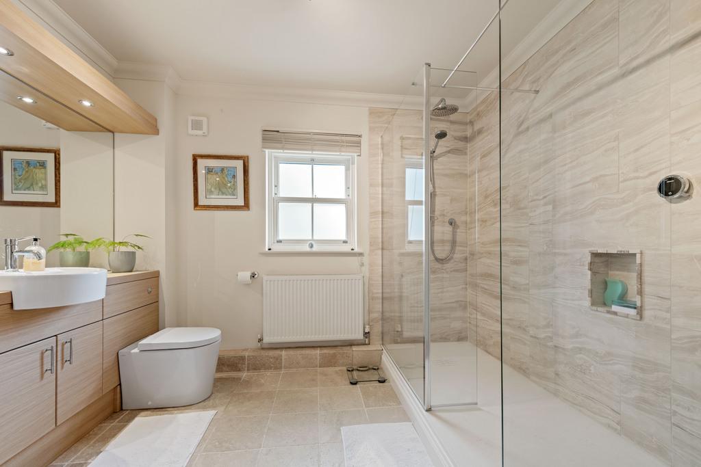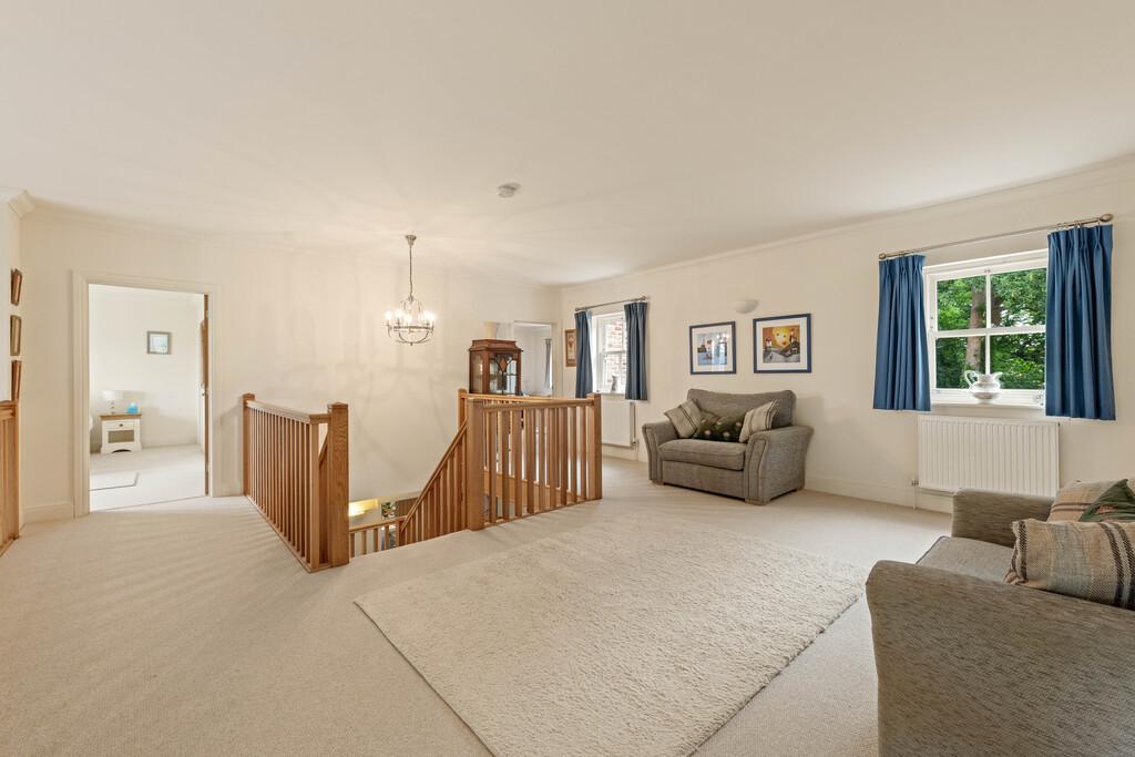 The first floor continues the sense of space and comfort, with an open landing doubling as a relaxed sitting area. The principal bedroom enjoys its own south facing private balcony, enjoying views over the fields behind, along with a walk-in wardrobe and a sleek en-suite bathroom. Two further bedrooms share a well-appointed Jack & Jill bathroom, while the second bedroom suite benefits from a large dressing room and its own en-suite shower room. A large room above the garage provides extensive accessible storage via the 2nd bedroom but also offers fantastic potential to be used as a playroom or sitting room.
