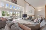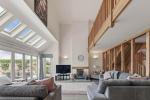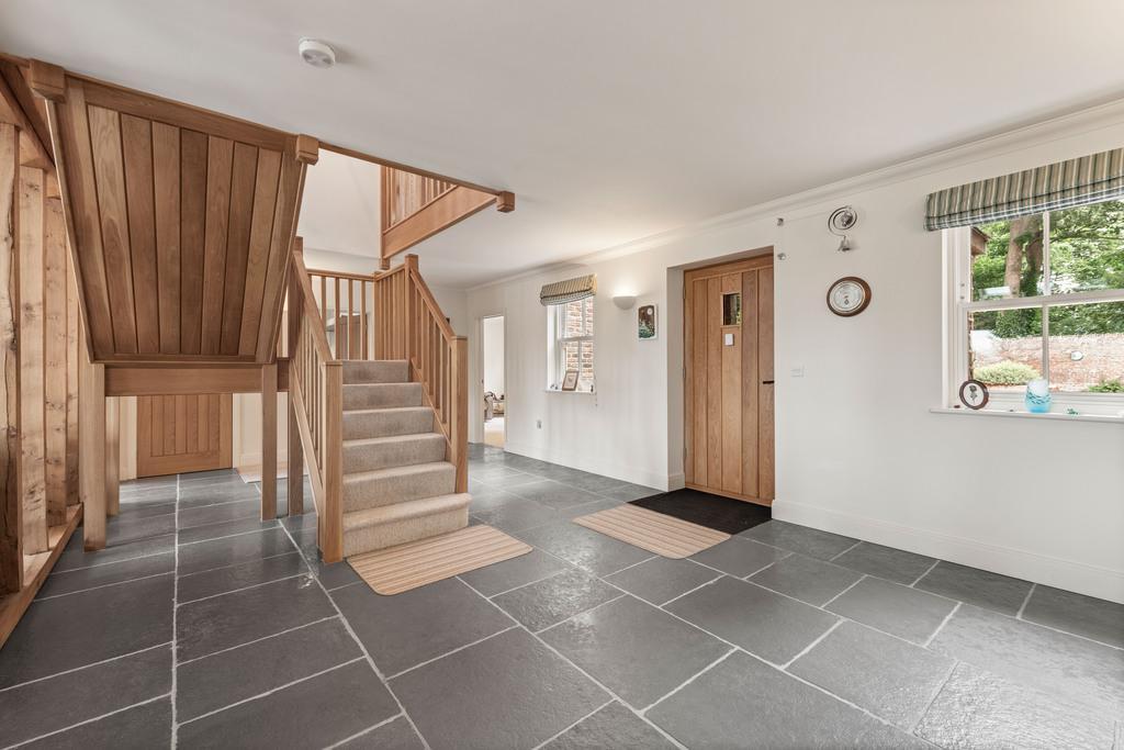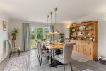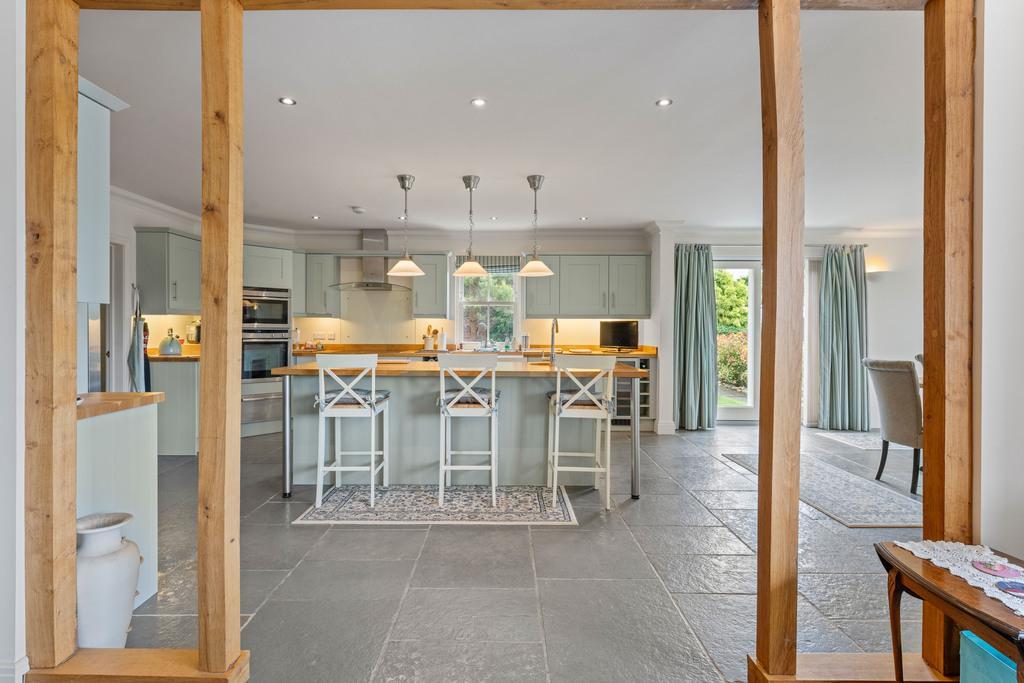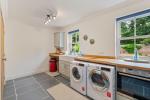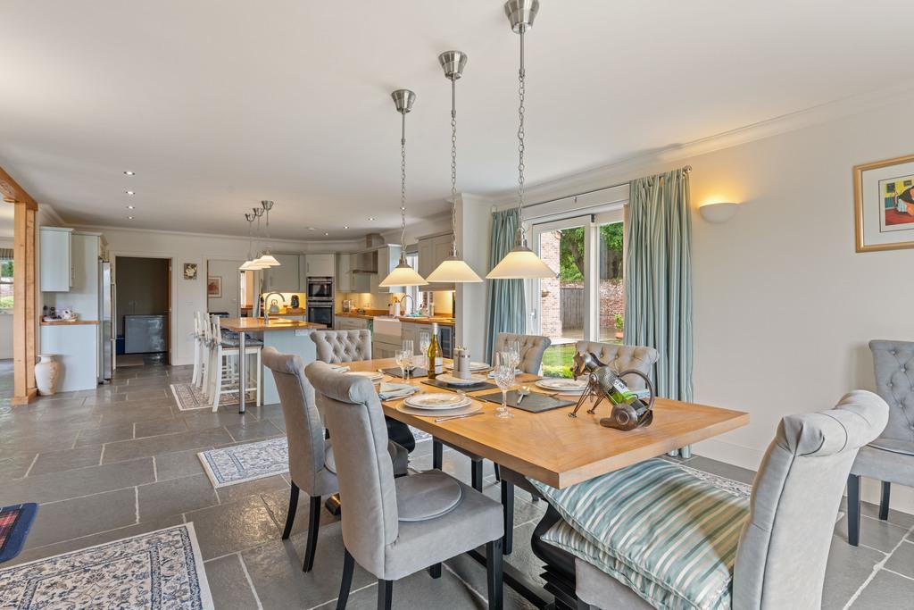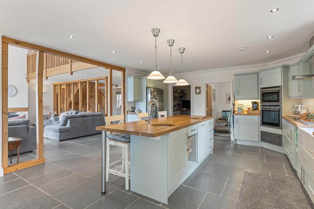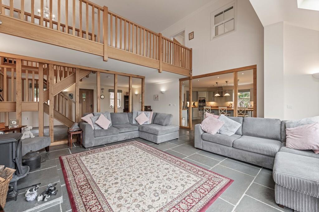 Upon entering through the oak-framed porch, the impressive reception hall sets the tone with a striking central oak staircase and open studwork leading into the lounge. This inviting space features a vaulted ceiling, a wood-burning stove, and full-width bifold doors opening onto the patio. The adjacent kitchen/dining area is a true heart-of-the-home space, featuring oak worktops, and a central island with breakfast seating. A range of high-spec Neff appliances, a walk-in pantry, and a large utility room featuring a useful drying room, double sink and an oven add both convenience and practicality. Additional ground floor highlights include a study, sitting room, shower room and a spacious rear hall with direct access to a workshop and an integral double garage.