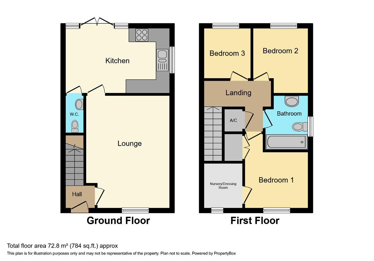 The accommodation consists of a welcoming entrance hall, spacious lounge and the lovely, modern open plan kitchen/diner and a ground floor wc. The kitchen has plumbing installed for a dishwasher + washing machine. The first floor provides the landing area, family bathroom, three bedrooms with the master benefitting from a built in double wardrobe and a nursery/dressing room (formally an en suite shower room). The plumbing was capped off but is still accessible if anyone wishes to return the nursery back to an en suite.
