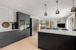 The interior boasts a luxurious open-plan kitchen/diner/family room, equipped with a breakfast bar, wine fridge, double oven, microwave combi oven, and hob. This space is enhanced by bi-folding doors that extend the room into the garden, offering stunning views of the surrounding landscape.