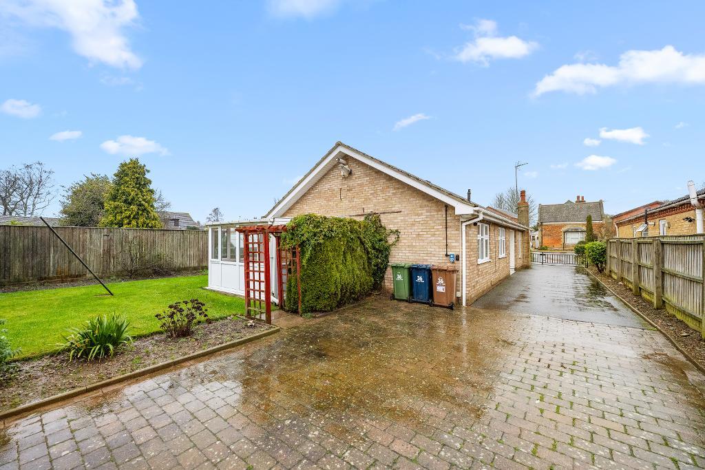 The bungalow offers plenty of internal space, with a practical layout that flows from a central hallway. There are three double bedrooms, including a notably spacious principal bedroom measuring over 24ft in length. The living areas comprise a bright lounge with dual aspect windows, a separate dining room, and a conservatory overlooking the garden. The kitchen is well-sized and positioned adjacent to the dining room, offering potential for open-plan redesign. A family bathroom and separate WC complete the accommodation, alongside useful storage and a lean-to utility space.