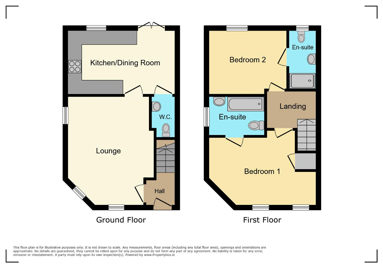 The accommodation comprises a spacious living room, a kitchen/dining room with patio doors opening onto a fully enclosed, turfed rear garden, and a ground floor cloakroom. Upstairs, there are two double bedrooms, each with its own en-suite shower room, providing comfortable and private accommodation.