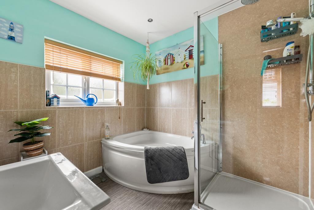 Upstairs, the first floor offers three bedrooms and a well-proportioned family bathroom. Bedroom three has been fitted with premium Sharps wardrobes, making it an ideal dressing room-style space. The bathroom includes a four-piece suite for added convenience.