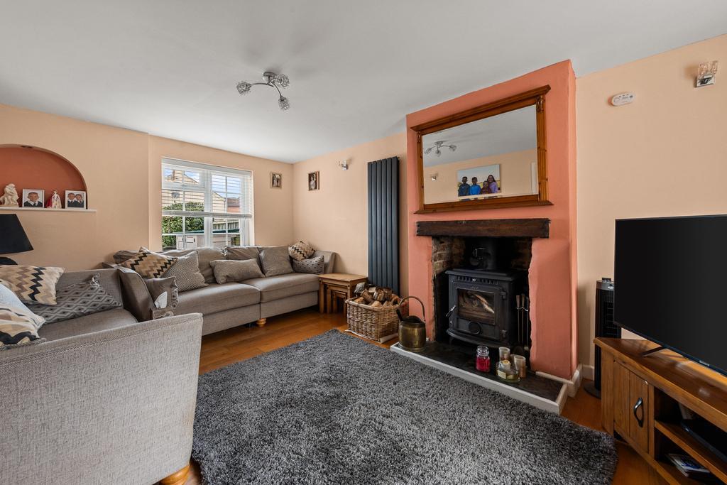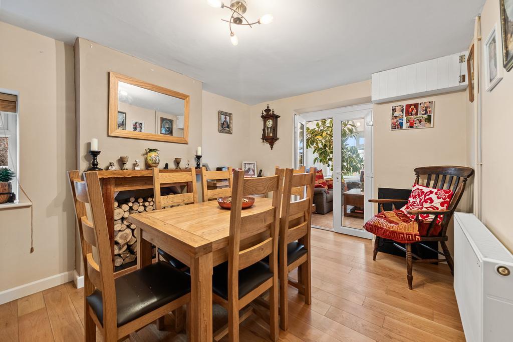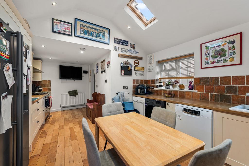 Stepping inside, there is an impressive kitchen/diner, the true centrepiece of the home and a standout element of the extension. This beautiful room features a vaulted ceiling with Velux-style windows that pour natural light into the space, creating a bright and open atmosphere. Finished in an elegant shaker style with generous wooden worktops, it delivers a warm, country-inspired aesthetic. The wooden flooring enhances the inviting feel and continues through much of the ground floor, offering both style and practicality.