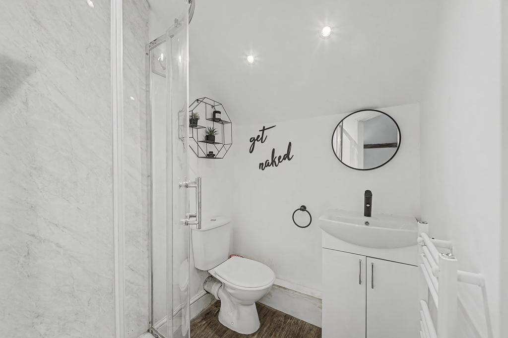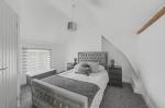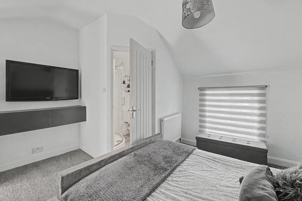 Upstairs, the spacious master bedroom benefits from high ceilings and its own modern ensuite shower room. A second bedroom sits across the landing, ideal for guests, family, or a home office.