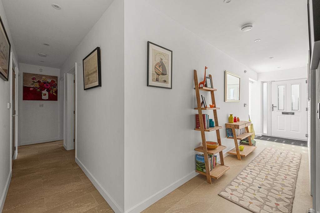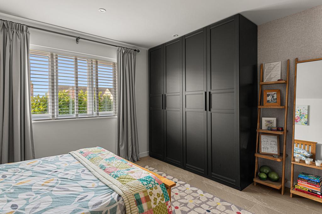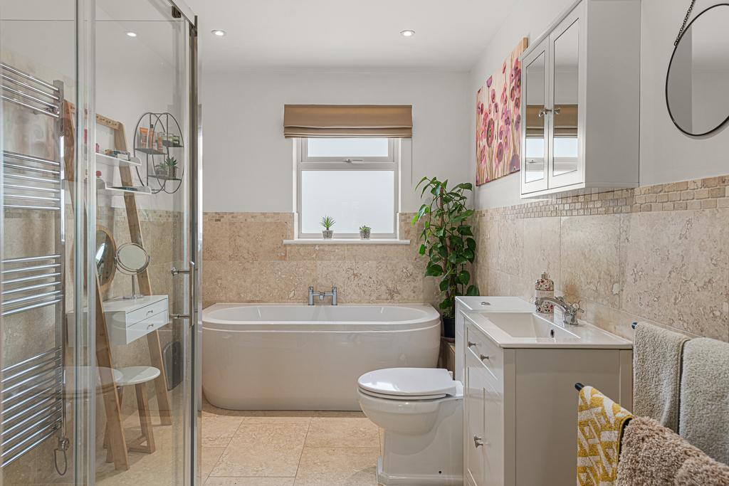 There are three double bedrooms, where wardrobes can stay if required. The main bedroom has an ensuite bathroom, and there is a separate family bathroom with bath, shower cubicle, WC and wash hand basin.