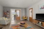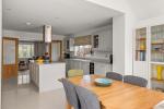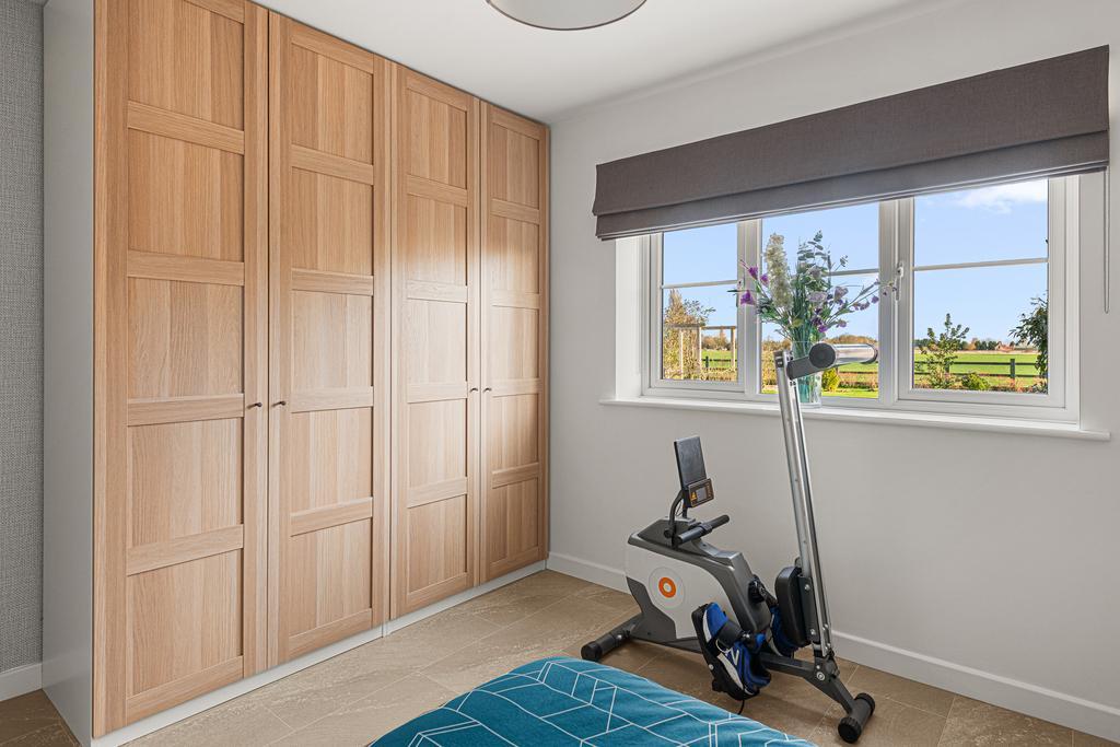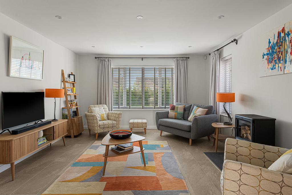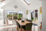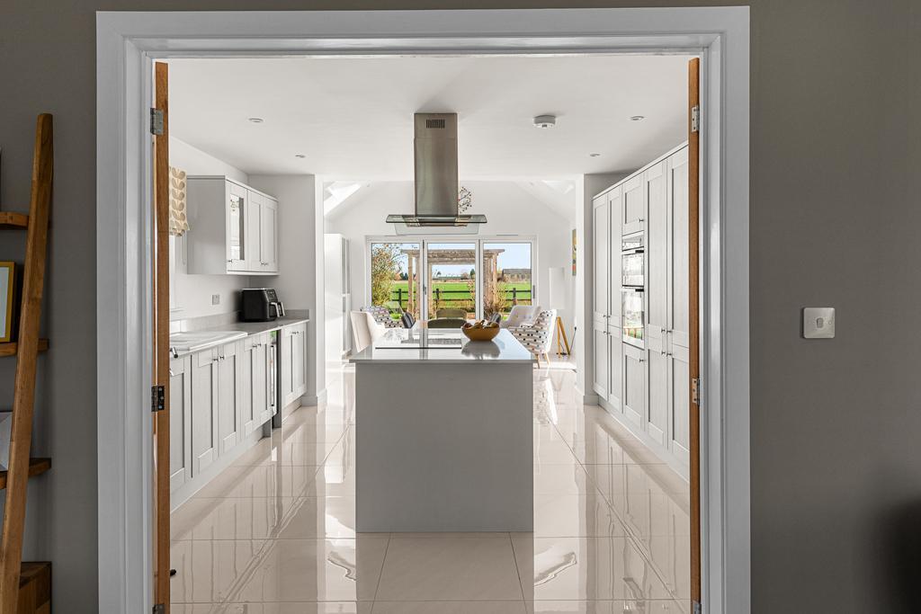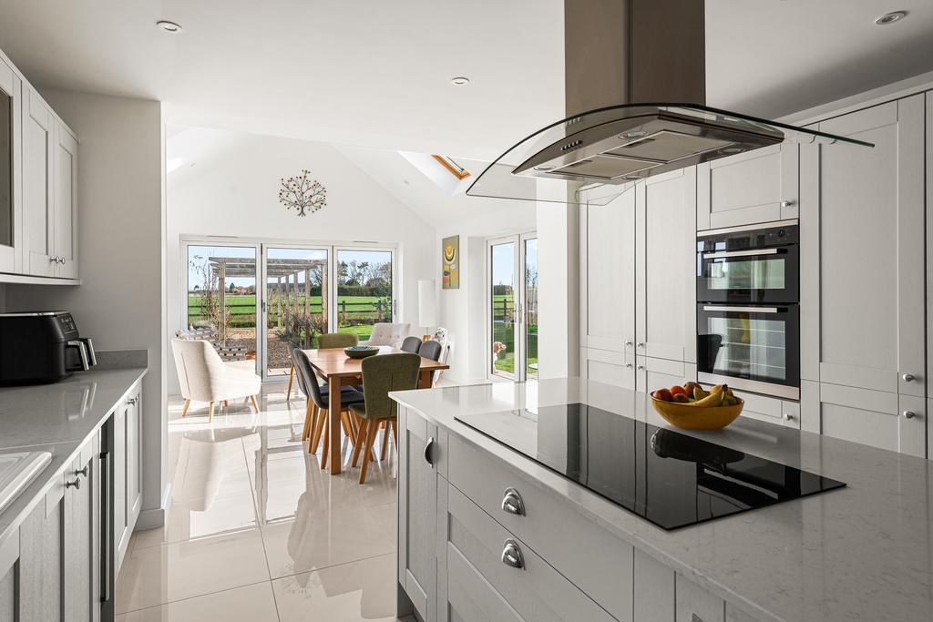 The Howdens kitchen is fitted with modern appliances, including a full length integrated fridge, full length integrated freezer, dishwasher and wine cooler. A central island incorporates storage and an induction hob with ceiling-mounted extractor. The kitchen opens into the sunroom/dining room, which has a vaulted ceiling and bi-folding doors that provide panoramic views of the rear garden and fields beyond, as well as direct access outside. There is also a useful separate utility room.