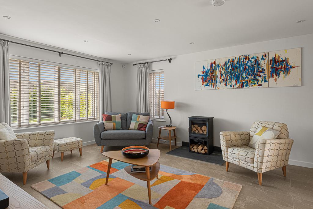 The property is entered via a welcoming hallway with a feature side window. There are two reception areas: a lounge to the front with a floor-standing wood burning stove, and a sunroom/dining room to the rear. The lounge connects to the kitchen via double doors, creating the option of open-plan living when desired.